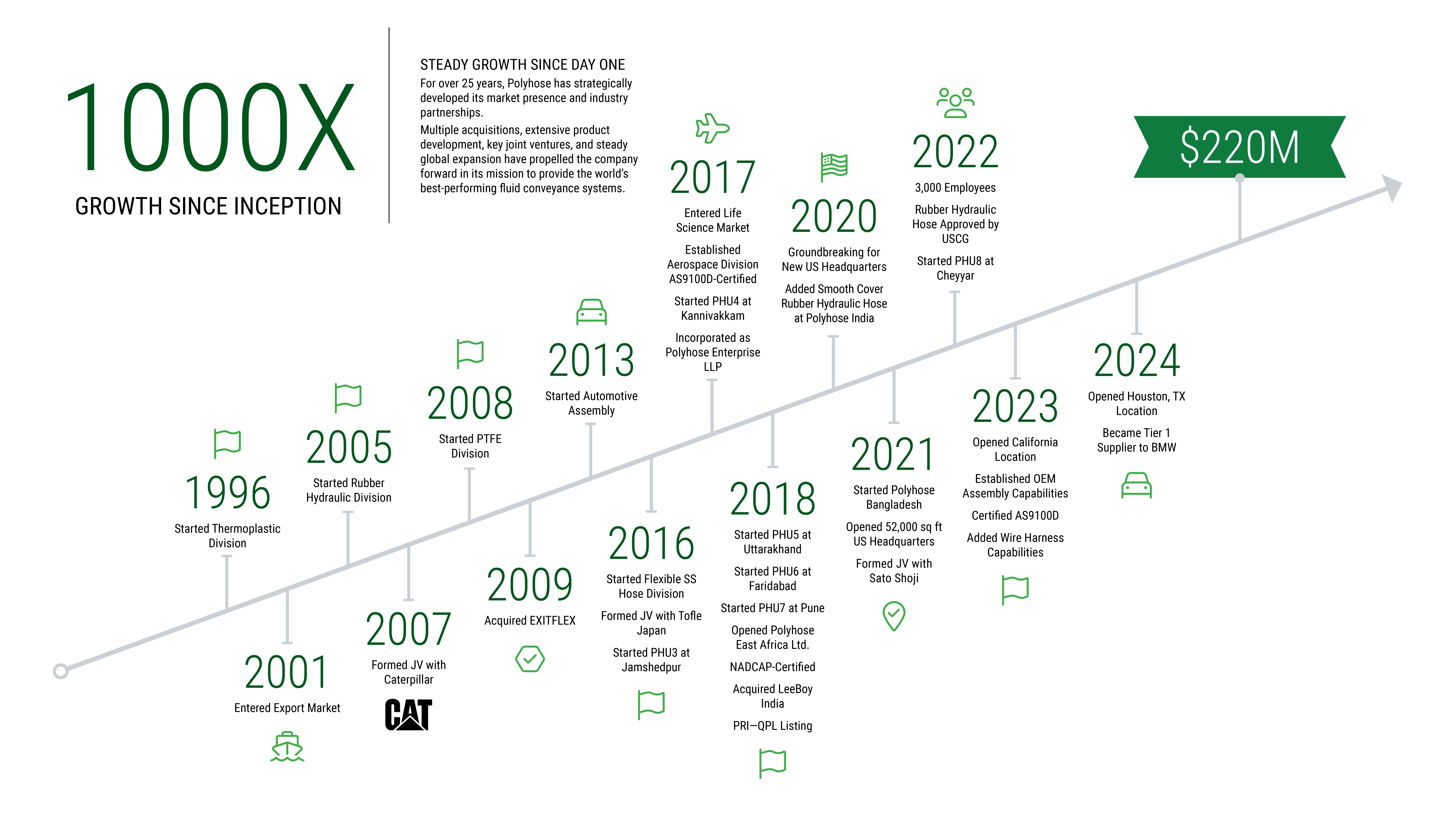 Since the founding of Polyhose, the company has continued to grow in both strength and size—now offering the widest range of flexible fluid conveyance products in the industry. In 2005, Polyhose incorporated a second division in rubber hydraulic manufacturing. Further expansion in 2008 brought the PTFE division to the fast-growing business, and the acquisition of Exitflex SA in 2009 put Polyhose on the global map.
